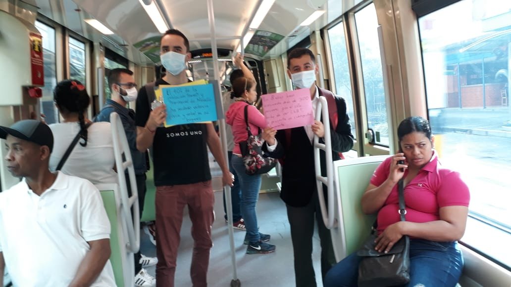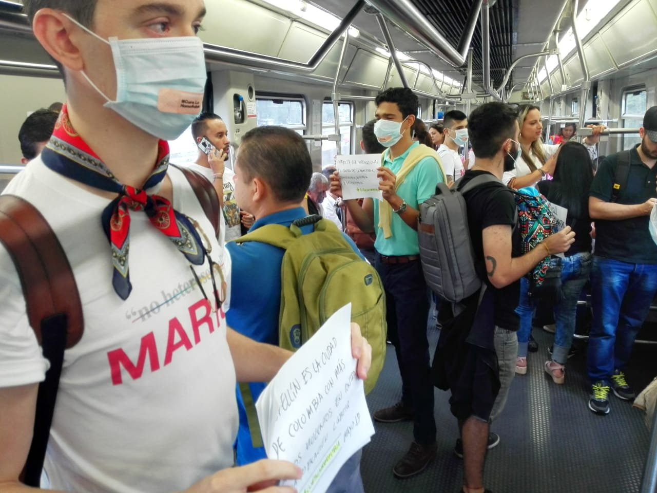 En silencio, con tapabocas y carteles, activistas de Medellín se montaron al @metrodemedellin para pedir la cura contra homofobia en la ciudad #DíaContraLaHomofobia #CuraLaHomofobia @elcolombiano @ColombiaDiversa @ELTIEMPO pic.twitter.com/JhdhvOpeCW