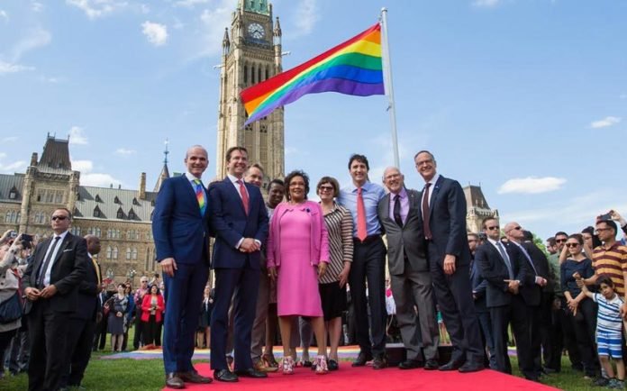 La propuesta de izada de la bandera arcoíris partió del diputado Randy Boissonnault, quien declaró que la idea se había fraguado durante una conferencia sobre derechos LGTB que había tenido lugar en Otawa. Todas las fuerzas políticas estuvieron de acuerdo, y la bandera del Orgullo ondea en la colina donde se sitúa el Parlamento canadiense durante todo el mes.