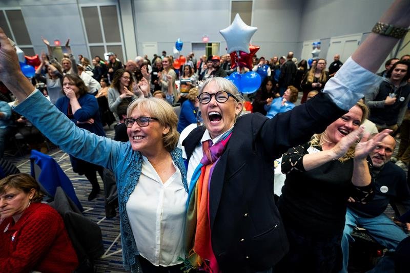 Simpatizantes de la candidata demócrata a la Cámara por Kansas Sharice Davids celebran su victoria.EFE