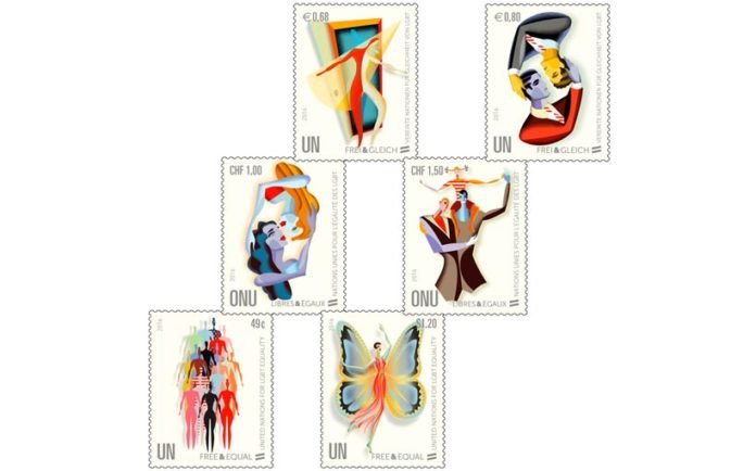 Esta organización, que en numerosas ocasiones ha sorprendido por sus estrategias para promover la defensa de los derechos de la población LGBT en todo el mundo, ha lanzado una nueva colección de estampillas con el eslogan de campaña “LIBRES E IGUALES”, compuestas por 6 motivos diferentes alusivos a la presencia en todos los rincones del mundo (“We are everywhere”) de las personas transgénero, las parejas lésbicas, familias diversas, parejas de hombres gay, y una invitación a salir del «clóset».