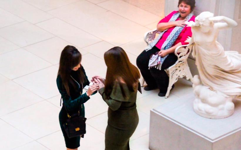 En el Art Institute of Chicago Jessica se arrodilló y le pidió matrimonio, mientras sus amigos sostenían un cartel desde la segunda planta. Fué tan romántico que el personal de seguridad terminó aplaudiendo y los espectadores más cercanos quedaron asombrados.