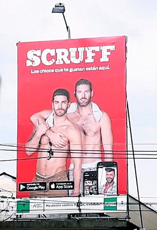 Con dos hombres abrazados recreando una pareja homosexual, la aplicación de citas online SCRUFF, se toma una valla de gran formato y notoriedad sobre el Parque del Poblado de Medellín, rompiendo así con el estigma hacia la publicidad abiertamente diversa.