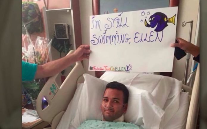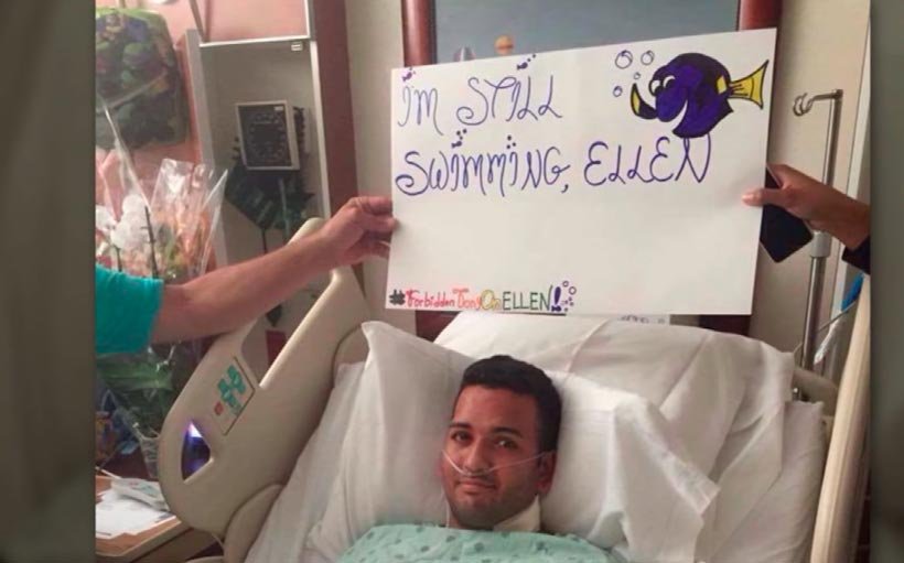 La historia conmocionó a Ellen, no sólo por el impacto social generado, sino también porque gracias a los amigos de las víctimas, a redes sociales llegó una fotografía de Tony recuperándose en su cuarto del hospital junto a un aviso que dice «Todavía estoy nadando Ellen» («I’m still swimming Ellen«) donde aparece Dory.