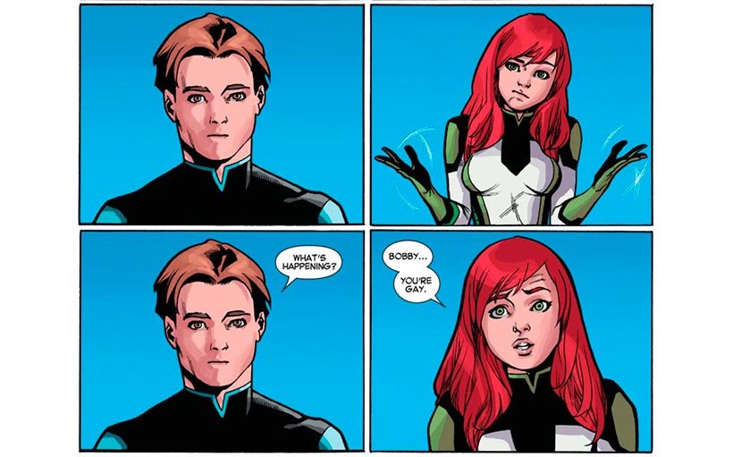 En la edición No. 40 de la serie All New X-men publicada el 22 de abril, descubrimos que Iceman (o Bobby Drake) es gay.